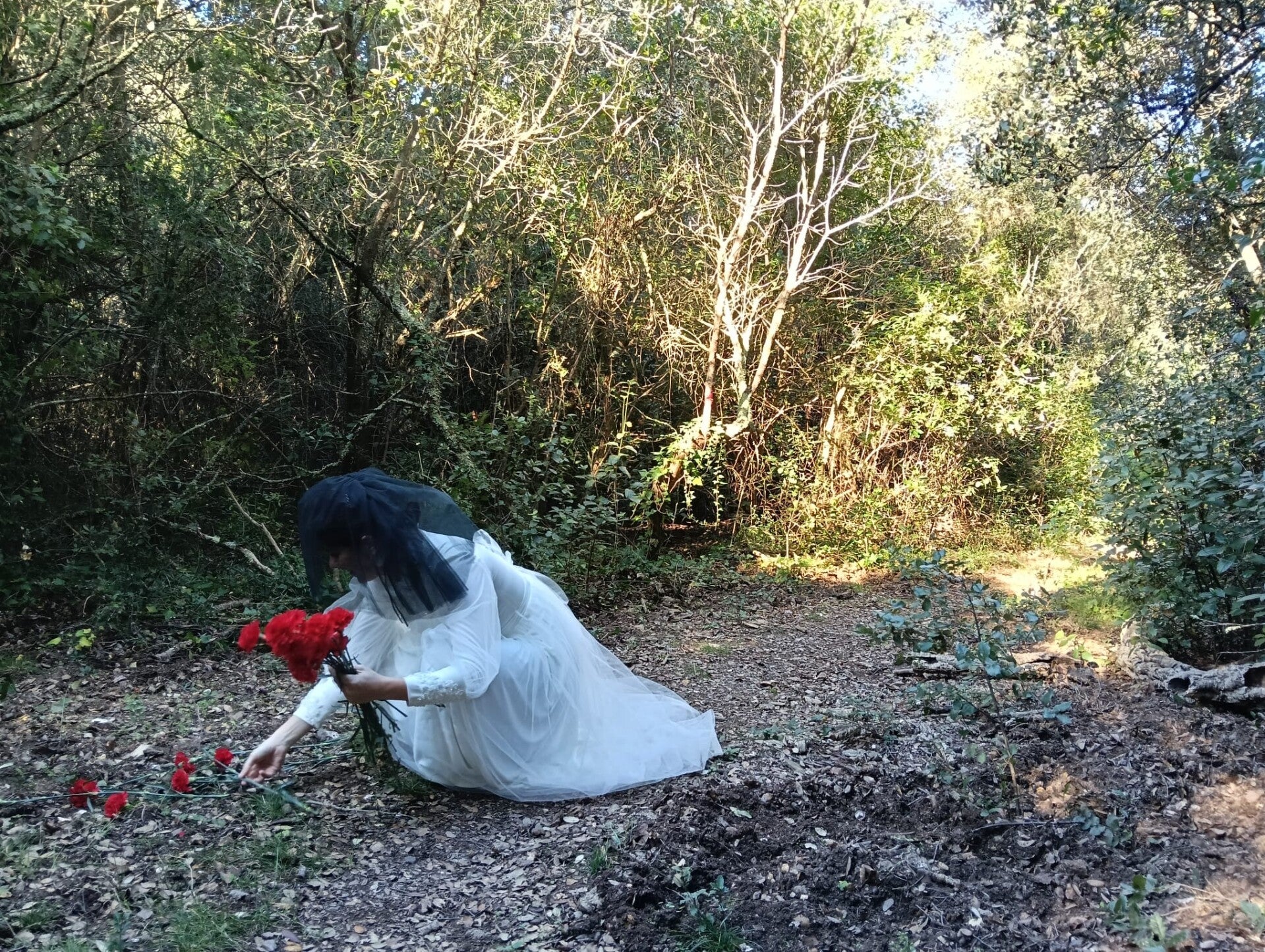 La videoperformance, creada en el 50 aniversario de la muerte de Francisco Franco, evoca un réquiem por el pacto de silencio que siguió a la dictadura. Vestida de novia y con un velo negro de luto, la figura oscila entre celebración y duelo. El lanzamiento de claveles rojos se convierte en un gesto de memoria para los fantasmas de la historia que aún reclaman ser escuchados.
